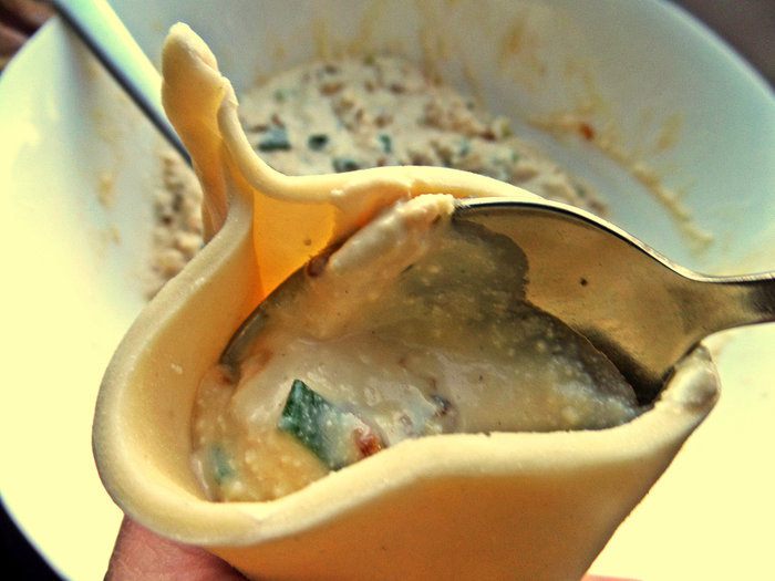 Теперь расширяем открытую сторону и буквально вливаем по ложечке начинку. У меня вошло по 2 ч.л.