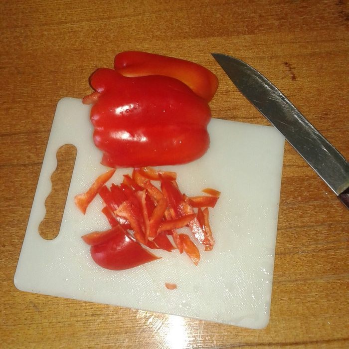 Перец помыть, почистить от семян и нарезать соломкой.