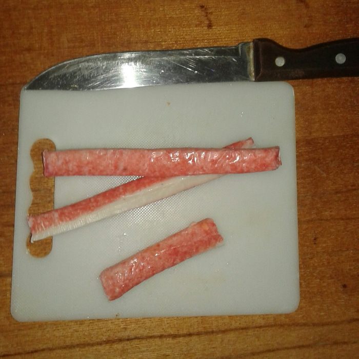 Крабовые палочки тоже нарезаем соломкой.