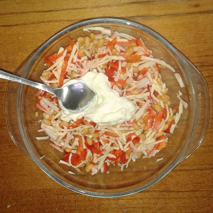 Смешиваем все ингредиенты и заправляем майонезом. Приятного аппетита!