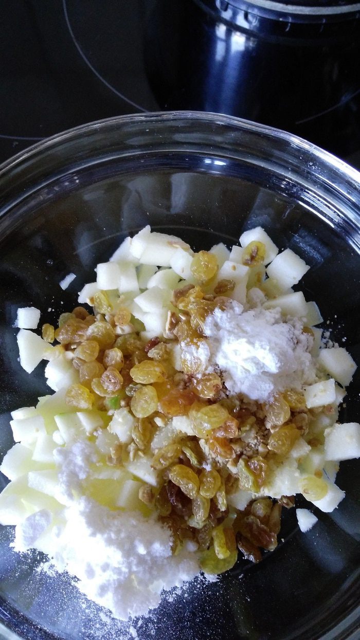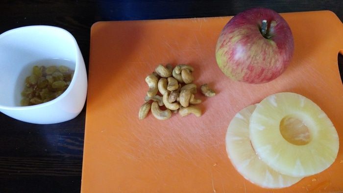 Для второй начинки промыть и обсушить изюм, мелко нарезать очищенное яблоко и 2 колечка ананасов консервированных. Измельчить кешью.