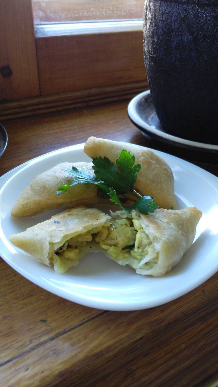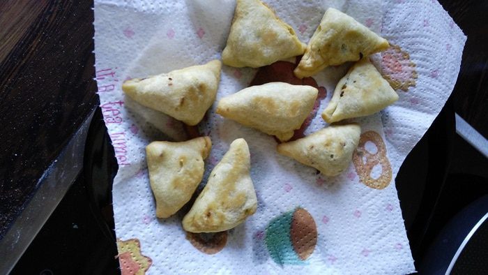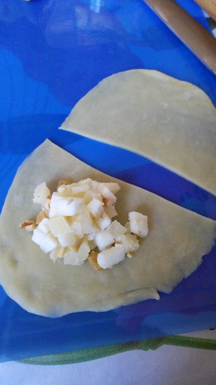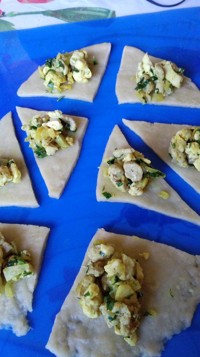 Тесто разделить на 2 части, раскатать тонко, 2-3 мм толщиной. Для мясных самосов я нарезала тесто на треугольнички, добавила по чайной ложке начинки.