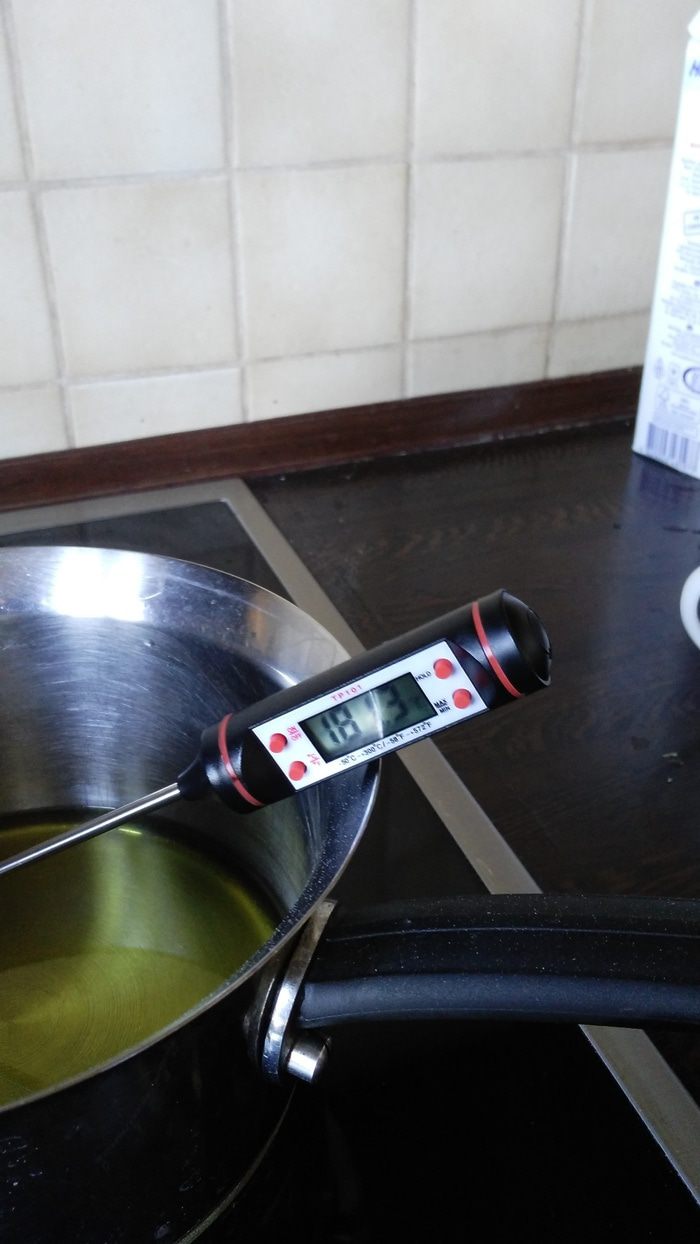 Масло для фритюра разогреть на среднем огне примерно до 180 С. У меня совершенно внезапно закончилось подсолнечное масло, поэтому добавила оливковое и налила маловато, конечно.