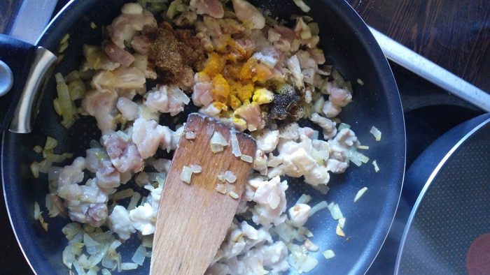 Обжаривать до готовности мяса, посолить, добавить специи по вкусу (у меня перец черный, куркума и кориандр). В готовую начинку добавить мелко нарезанную зелень (у меня петрушка).
