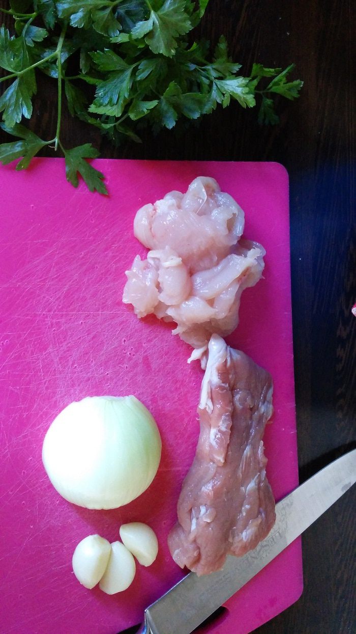 Для первой начинки измельчить лук и чеснок, обжарить на растительном масле, добавить мелко нарезанное мясо (у меня поровну филе курицы и свиной вырезки).