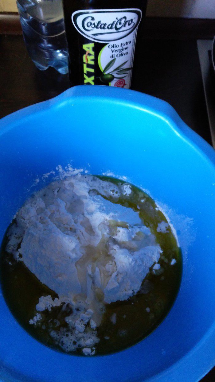 Смешать в миске муку, масло (у меня оливковое), соль и холодную воду.