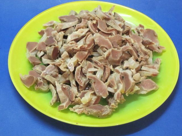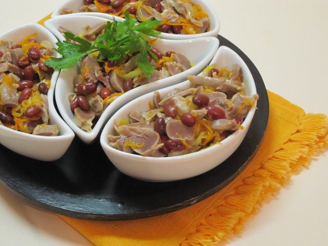 Домашний рецепт салата из куриных желудочков. Все просто, правда, не быстро, так как куриные желудочки требуют длительной варки. Куриные желудочки не так уж часто бывают в домашнем рационе, этот салат восполнит пробел. Вкусно и сытно. За основу салата взяла рецепт Леночки Калининой.