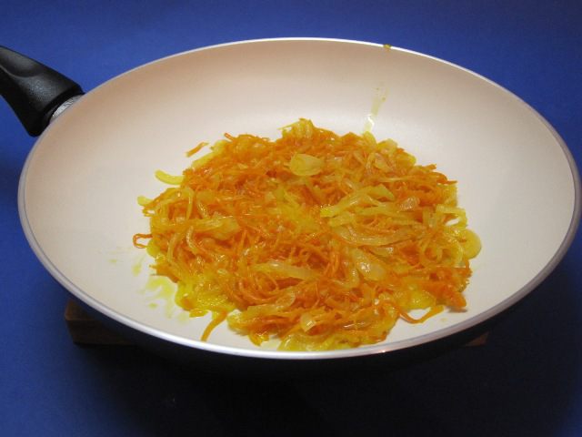 Лук и морковь обжарить на сковороде с разогретым растительным маслом. Остудить.