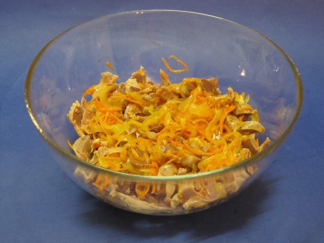 К куриным желудочкам выложить обжаренные морковь и лук.