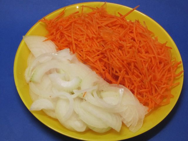 Морковь очистить, натереть на терке для моркови по-корейски. Лук очистить, нарезать тонкими полукольцами.