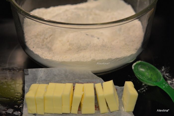 В большой емкости смешать муку, разрыхлитель, соль. Масло холодное нарезать на кусочки.