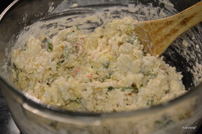 Добавить масло в муку, порубить, тесто будет комковатым. Добавить цукини, сыр протертый как моцарелла, например, и чеддар, томаты вяленые нарезанные и свежий базилик нарезанный. Добавить молоко и перемешать без усердства.