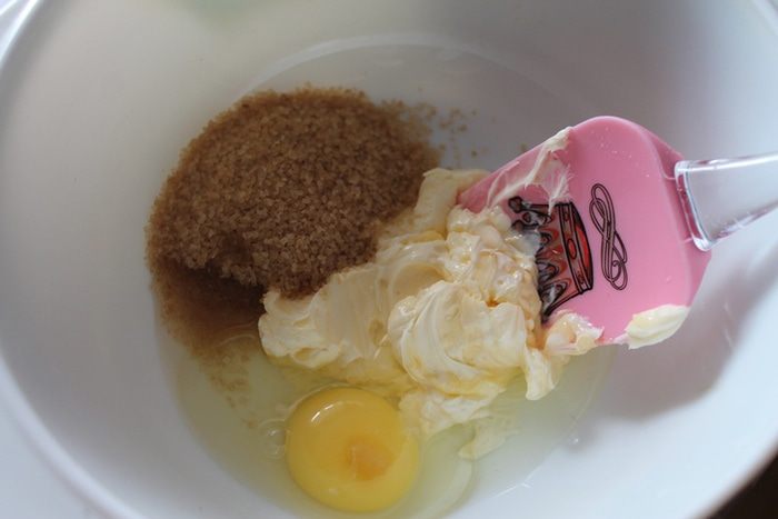 Включить духовку на 170 градусов. Размягченное сливочное масло, сахар, яйцо смешать до однородности лопаткой.