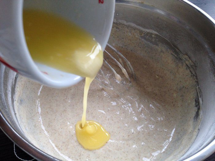К получившейся кефирно-яичной массе добавить сухие ингредиенты, перемешать до однородности. Влить растопленное сливочное масло.