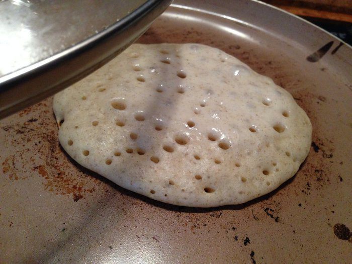 На сухую, хорошо разогретую сковороду налить тесто (я его разравнивала ложкой), накрыть крышкой и жарить панкейк. Как только появятся пузырики воздуха, панкейк перевернуть. Жарить панкейки на не большом огне (температуре).