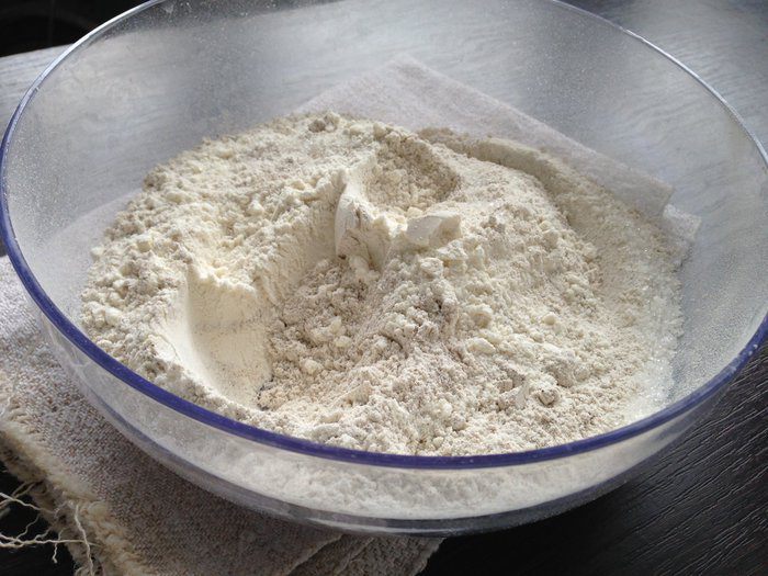 Просеять в миску оба вида муки. Добавить сахар, соль, соду и разрыхлитель. Перемешать.