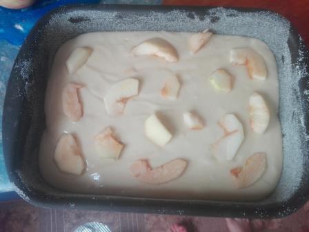 Выливаем тесто на яблоки, разравниваем если нужно.