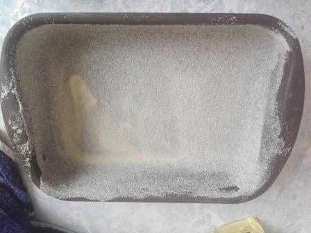 Форму для запекания смазываем маргарином и обсыпаем манной, излишки манки нужно убрать.