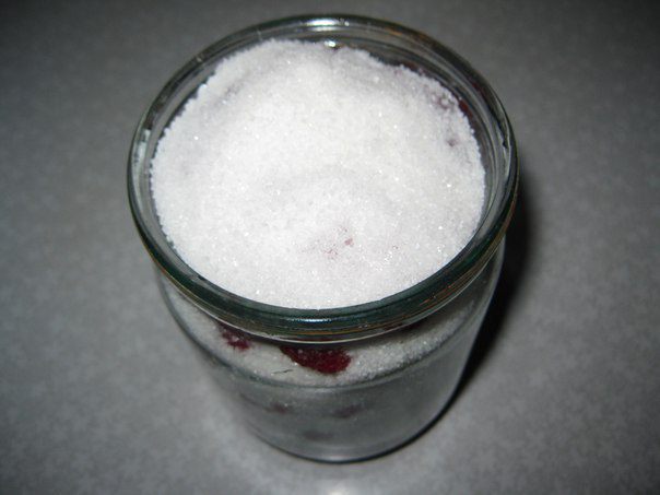 Сахар должен быть сверху. Ставим в холодильник, накрыв марлей. Через день-два малина пустит сок.