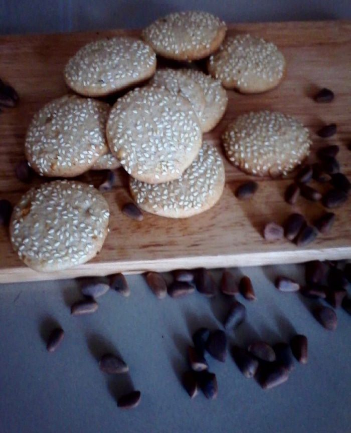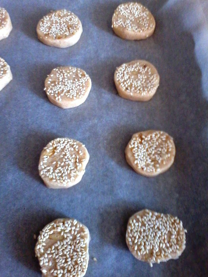 Разогреть духовку 180 гр. Обжарить кунжут. Достать тесто, нарезать на медальончики и обмакнуть верхнюю часть в кунжут.