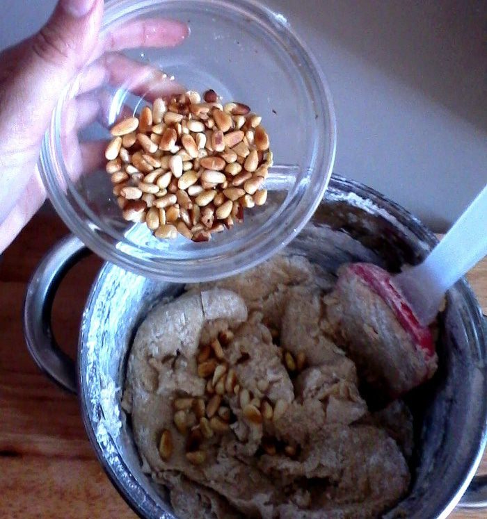 Добавить яйцо, снова взбить. Муку, разрыхлитель, корицу и мускатный орех просеять и смешать. Добавить обжаренные кедровые орешки.