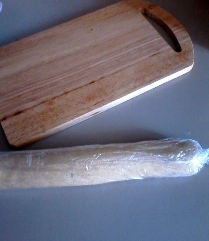 Тесто скатать в колбаску, обернуть пленкой и отправить в морозилку минут на 15-20.