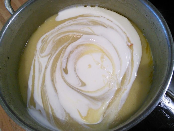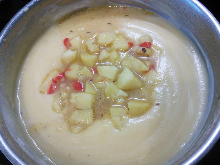 Вмешать кусочки картофеля, отложенные в сторону.
