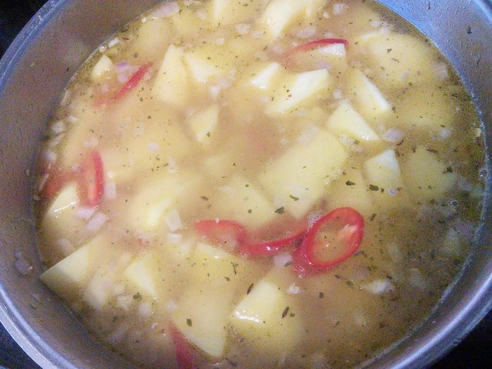 Залить овощным бульоном, посолить, поперчить, варить 15-20 мин до готовности картофеля.