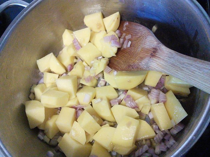 Шалот и картофель очистить, нарезать кубиком. Имбирь тоже порубить, но помельче. Всё обжарить прямо в кастрюле на разогретом масле до лёгкого "румянца".