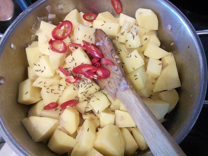 Чили освободить от семян и нарезать на тонкие полосочки. Остроту, т. е. количество чили, регулируйте по своему вкусу. Добавить чили и тмин.