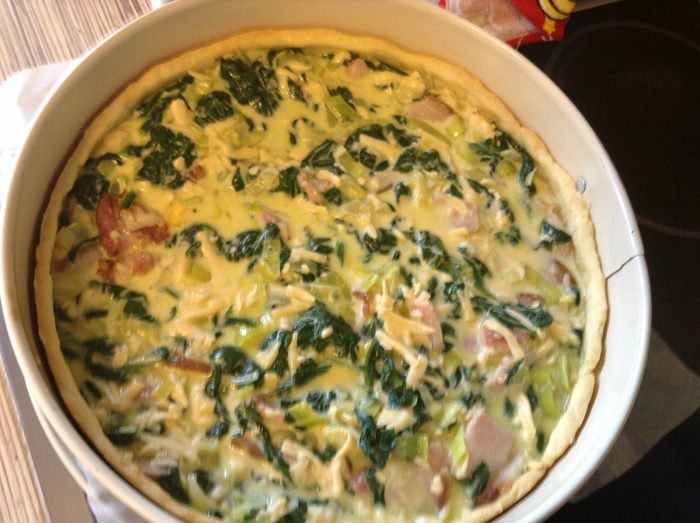Выложить начинку в форму, добавить заливку, выпекать 30-35 минут при 180С.