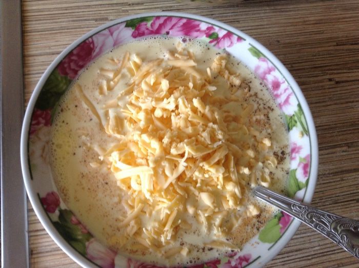 Заливка: немного взбить яйца (если крупные, достаточно и двух) добавить сливки, натертый сыр, соль, перец, мускатный орех.