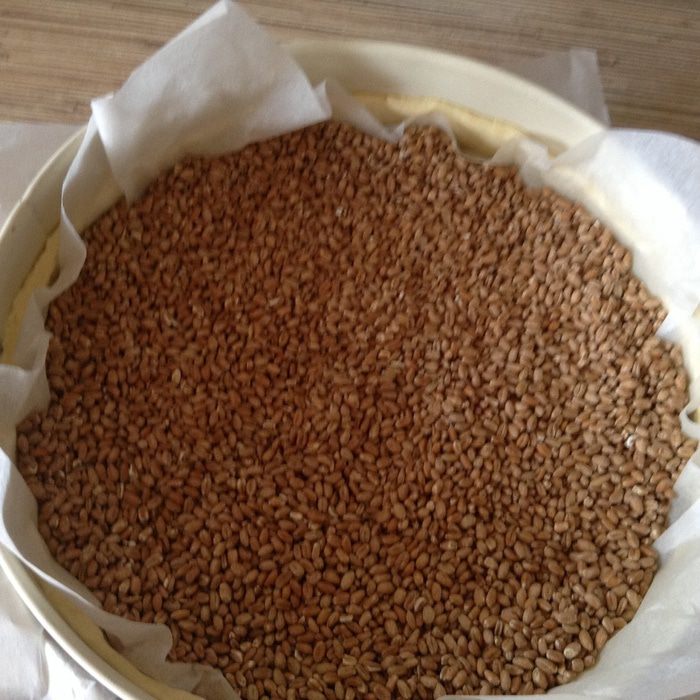 Достаю заготовку, укладываю пергамент и груз. Выпекаю 15 минут при 200С с грузом и 10 минут при 180С без груза.