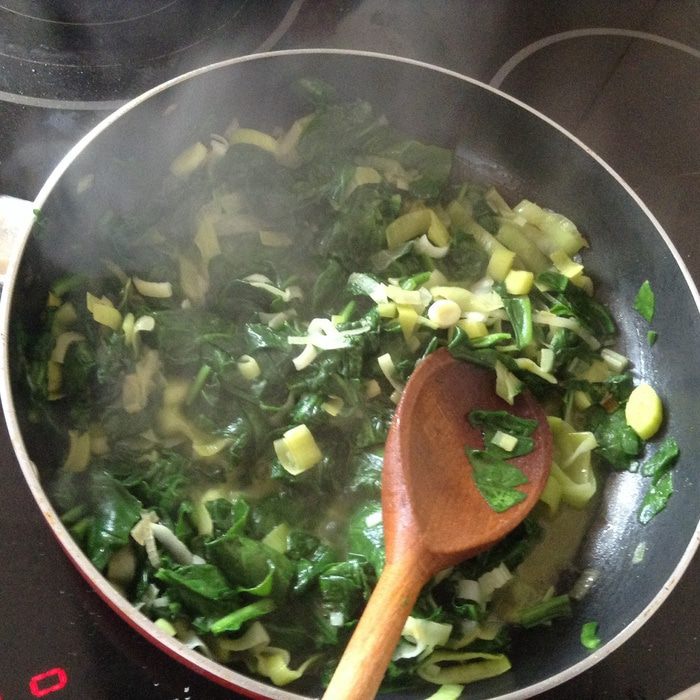 Добавить шпинат, тушить 2-3 минуты, откинуть на дуршлаг, чтобы убрать лишнюю жидкость.