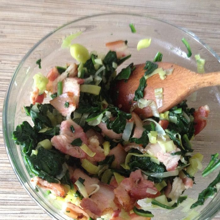 Соединить бекон и овощи.