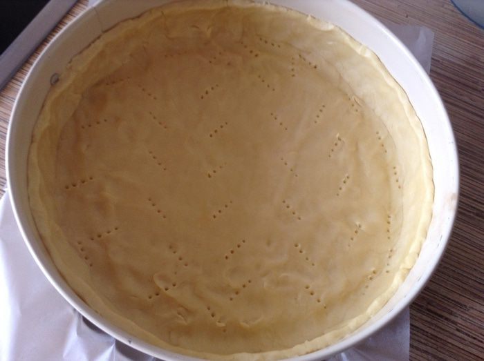 Выкладываю в форму с помощью пергамента (26см), распределяю, накалываю часто вилкой и только потом отправляю на 15 минут в морозилку, это нужно, чтобы края не осели при выпечке.