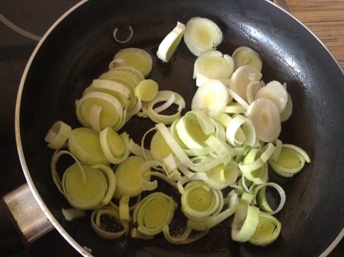 Снять бекон, выложить туда лук (порей можно заменить обычным), тушить до мягкости.