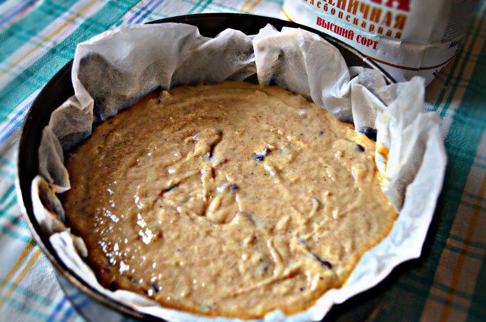 Тесто хорошо перемешать до однородности. Форму для выпечки выстелить бумагой для выпечки, смазать маслом. Выпекать пирог 35-40 минут при 180°С.