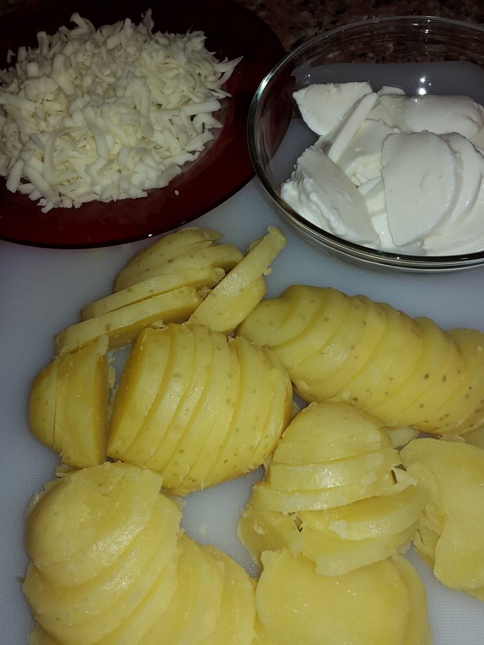Картофель и моцареллу режем дольками, сыр натираем на крупной терке.