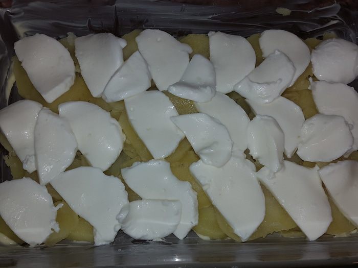 Форму для запекания смазываем сливочным маслом и выкладываем половину картофеля, солим. Сверху выкладываем моцареллу.