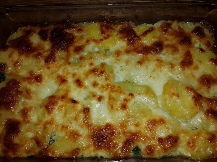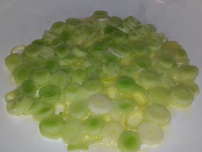 Картофель отвариваем в мундире. Лук-порей обжариваем на смеси оливкового и сливочного масла.