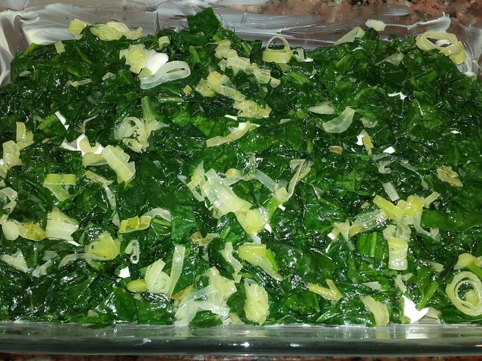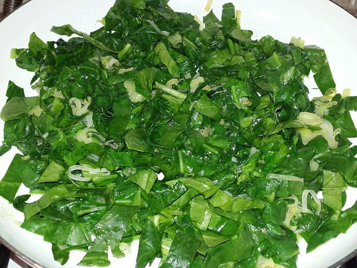 Шпинат моем, обсушиваем, режем соломкой и добавляем к луку. Солим, тушим до мягкости. *Если нет свежего шпината, можно использовать замороженный.