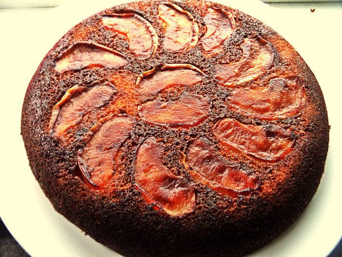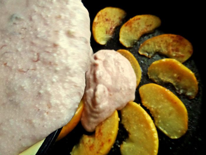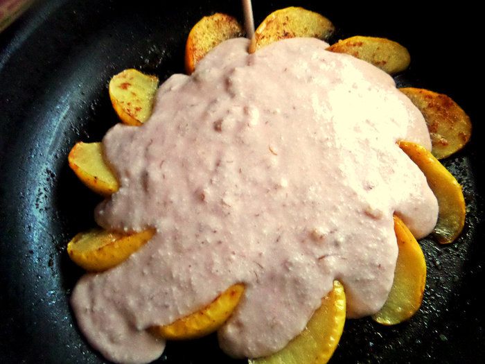Заливаем закарамелизированные яблоки тестом.