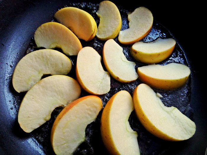Топим кусочек масла прямо в той форме, в которой будем печь и раскладываем веером яблочные дольки.