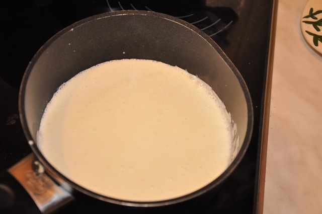 Одновременно подогреваем сливки, но не до кипения!