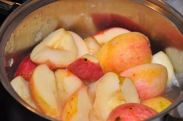 Яблоки режем на четыре части, вынимаем косточки и палочки, варим в кастрюле, добавив на дно небольшое количество воды. Варим как для яблочного пюре. Крышку не поднимаем, пока яблоки не превратятся в мякоть.