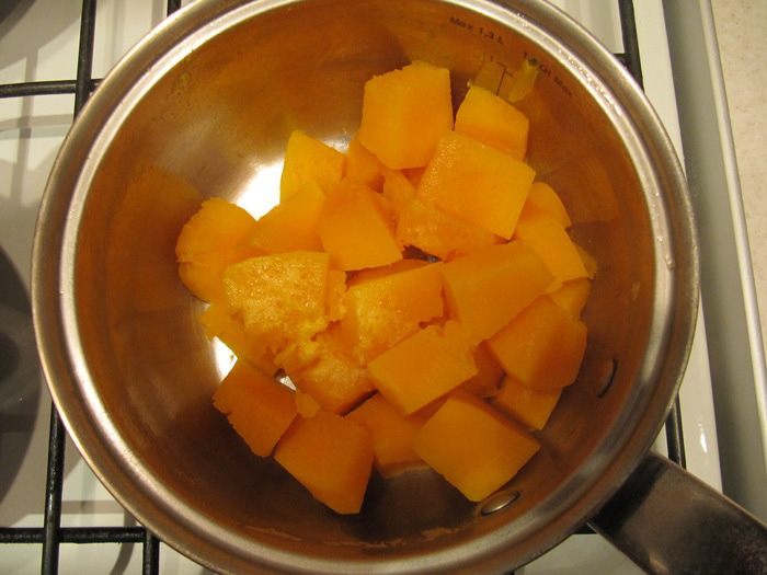 Тыкву порезать кубиками. Отварить до готовности, воду слить, размять в тыквенное пюре и охладить.