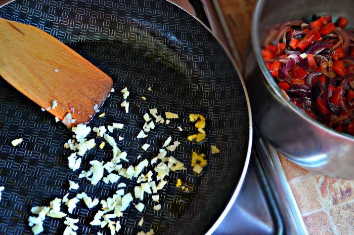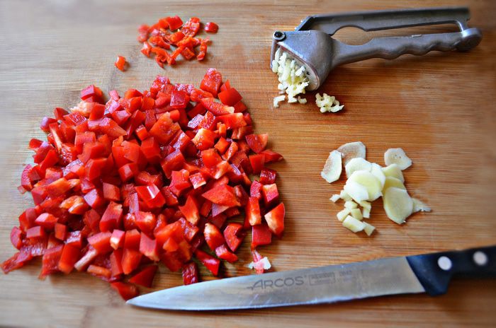 Сладкий перец очистите от плодоножки и семян, нарежьте мелкими кубиками. Чеснок, чили и имбирь (кусочек 2 см) измельчите.