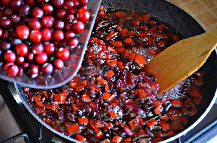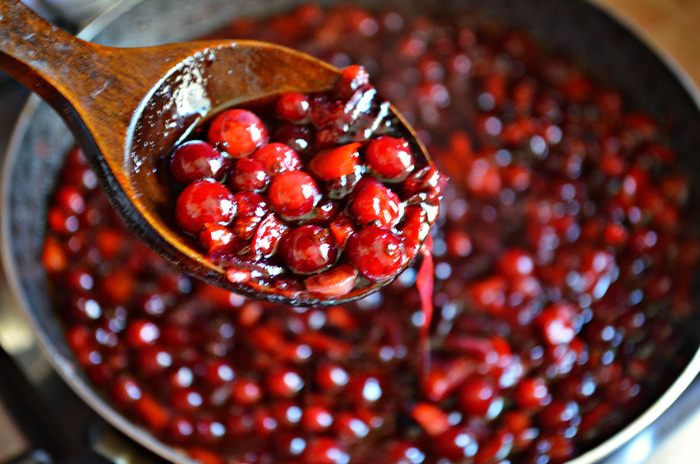 Клюкву очистите от мусора, промойте и добавьте в сковороду. Готовьте 5 мин. Часть ягод должна лопнуть, а часть остаться целыми.