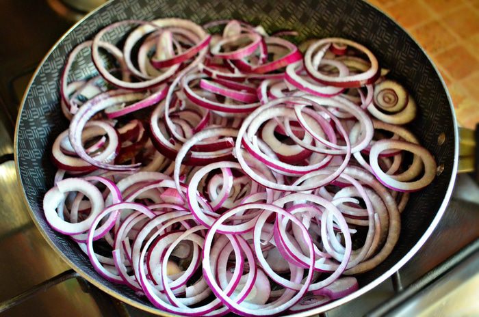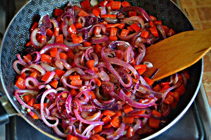 Лук нарежьте тонкими кольцами и обжарьте в оливковом масле на среднем огне 2 мин. Добавьте перец и потушите ещё 7 мин. Затем переложите овощи в миску и отставьте.